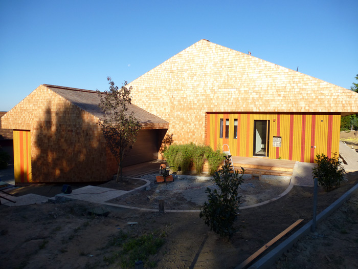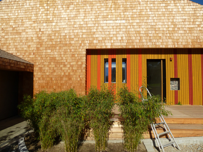 Die traditionellen Schindelarbeiten gehen hier in moderne Gestaltungselemente über.