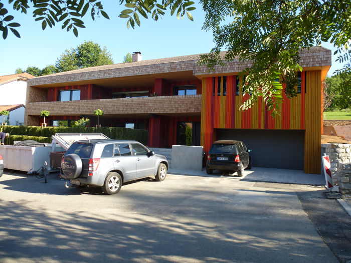 Besonderheiten bei diesem Haus sind: Eine integrierte Dachrinne, die Regenwasserfallrohre sind